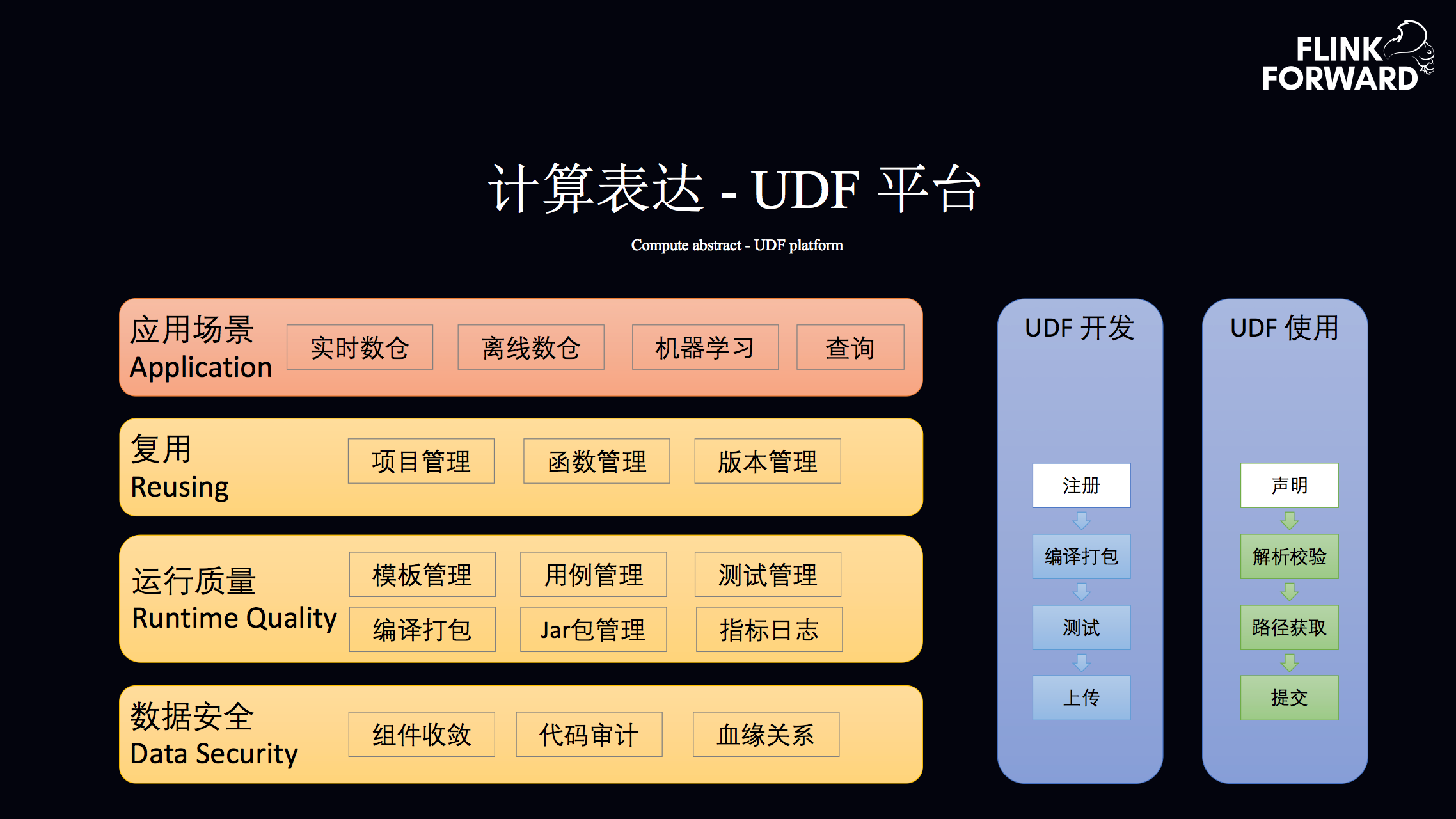 第二个层面,在数据安全基础上我们还会关注 UDF 的运行质量,平台将会为用户提供模板、用例以及测试的管理,为用户屏蔽编译打包、Jar 包管理的过程,并且会在 UDF 模板中进行指标日志的埋点和异常处理。