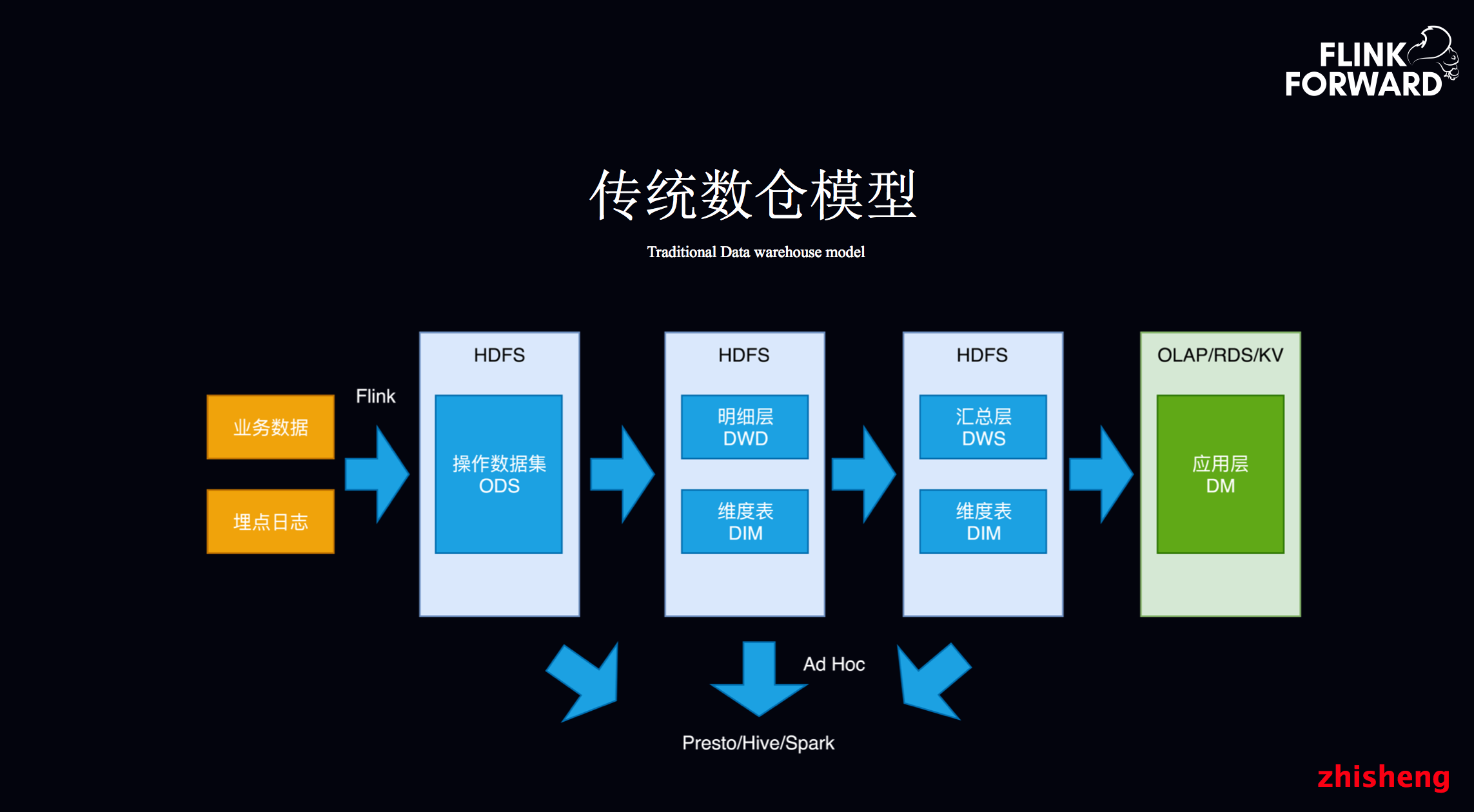 实时数仓的分层方式一般也遵守传统数据仓库模型,也分为了 ODS 操作数据集、DWD 明细层和 DWS 汇总层以及应用层。但实时数仓模型的处理的方式却和传统数仓有所差别,如明细层和汇总层的数据一般会放在 Kafka 上,维度数据一般考虑到性能问题则会放在 HBase 或者 Tair 等 KV 存储上,即席查询则可以使用 Flink 完成。