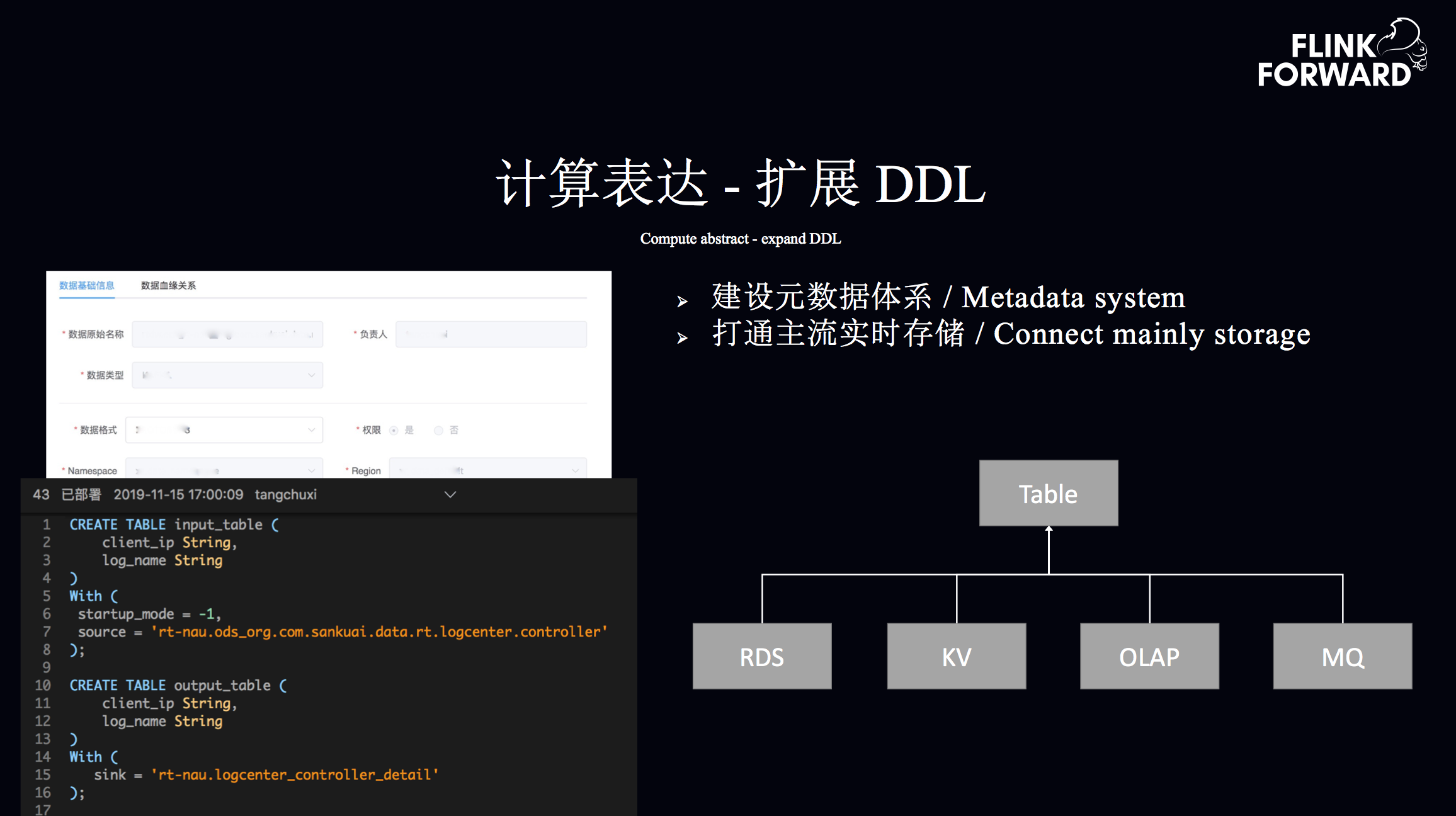 美团点评实时数仓平台基于 Flink 扩展了 DDL,这部分工作的主要目的是建设元数据体系,打通内部的主流实时存储,包括 KV 数据、OLAP 数据等。由于开发工作台和元数据体系是打通的,因此很多数据的细节并不需要大家在 DDL 中明确地声明出来,只需要在声明中写上数据的名字,和运行时的一些设置,比如 MQ 从最新消费还是最旧消费或者从某个时间戳消费即可,其他的数据访问方式是一致的。