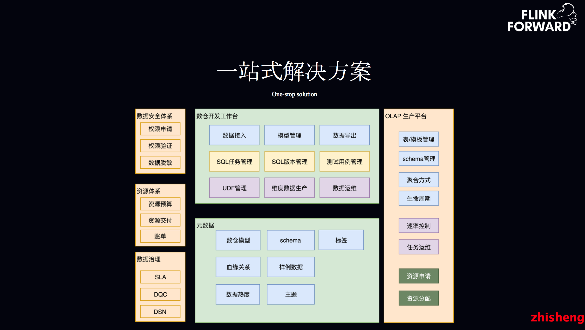 这里的一站式解决方案主要为用户提供了数据开发工作平台、元数据管理。同时我们考虑到业务从生产到应用过程中的问题,我们 OLAP 生产平台,从建模方式、生产任务管理和资源方面解决 OLAP 生产问题。左侧是我们已经具备数据安全体系、资源体系和数据治理,这些是离线数仓和实时数仓可以共用的。