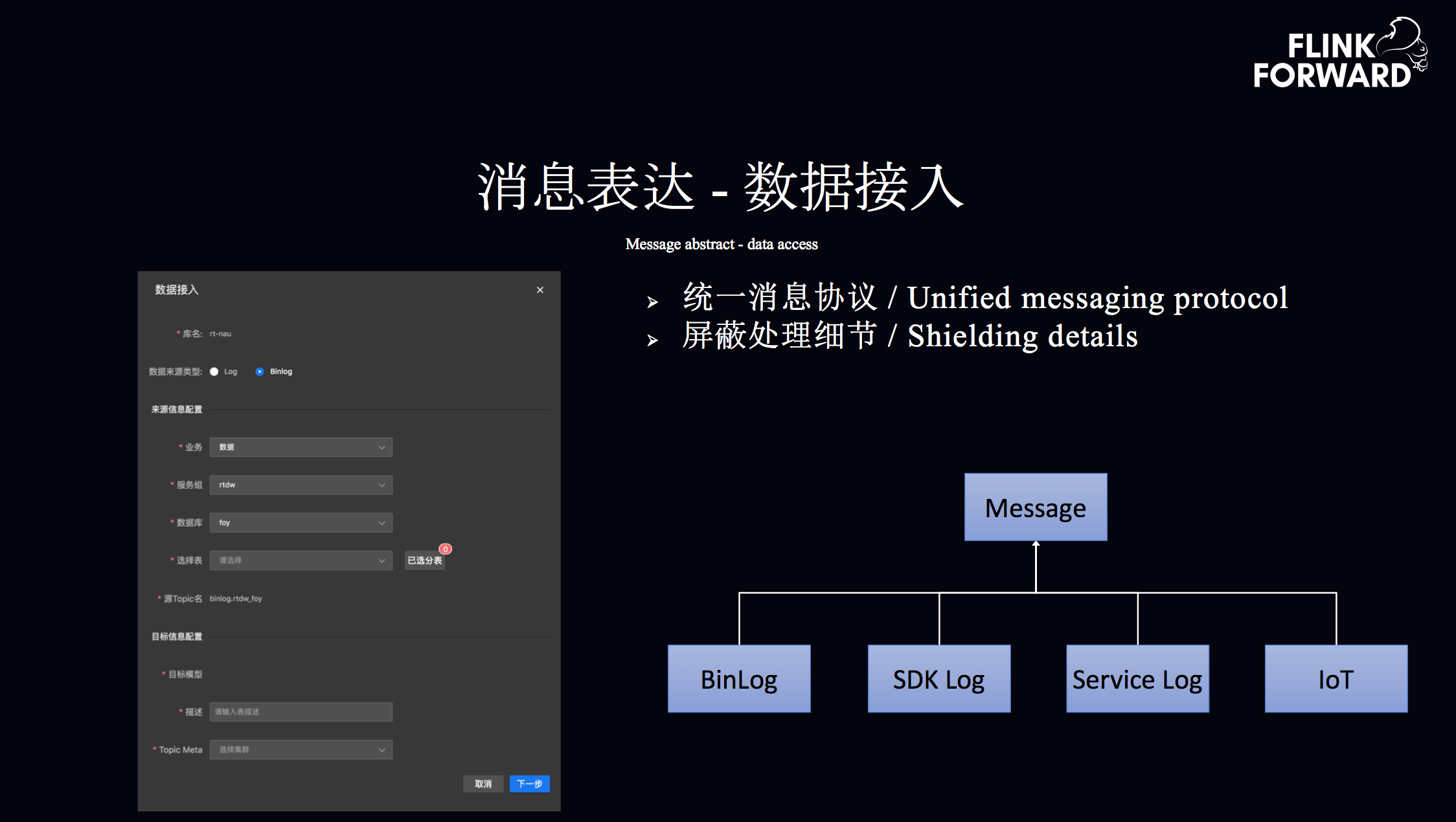 在消息表达层面,因为 Binlog、埋点日志、后端日志以及 IoT 数据等的数据格式是不一致的,因此美团点评的实时数仓平台提供数据接入的流程,能够帮助大家把数据同步到 ODS 层。这里主要实现了两件事情,分别是统一消息协议和屏蔽处理细节。