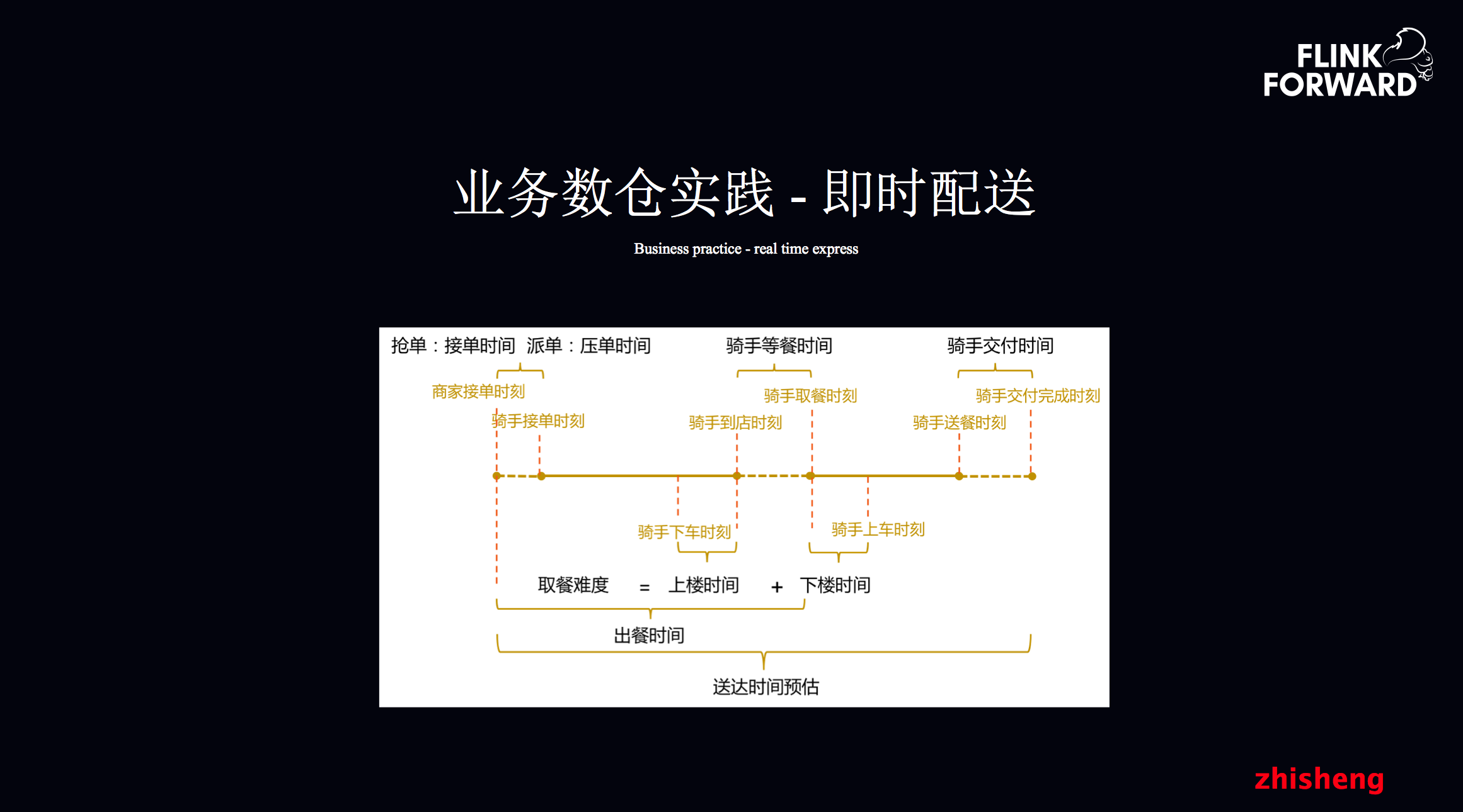 这里列举的另外一个业务数仓实践的例子是即时配送。实时数据在即时配送的运营策略上发挥了重要作用。以送达时间预估为例,交付时间衡量的是骑手送餐的交付难度,整个履约时间分为了多个时间段,配送数仓会基于 Storm 做特征数据的清洗、提取,供算法团队进行训练并得到时间预估的结果。这个过程涉及到商家、骑手以及用户的多方参与,数据的特征会非常多,数据量也会非常大。