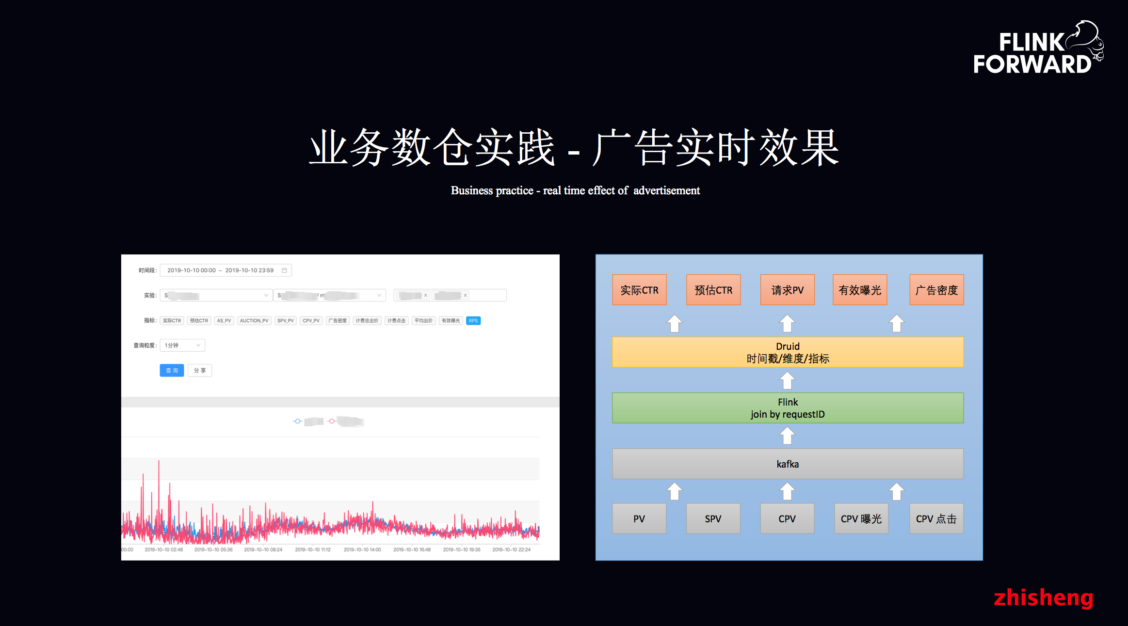 这里再举一个基于流量数仓的例子-广告实时效果验证。下图中左侧是广告实时效果的对比图。广告的打点一般分为请求(PV)打点、SPV(Server PV)打点、CPV(Client PV)曝光打点和 CPV 点击打点,在所有打点中都会包含一个流量的 requestID 和命中的实验路径。根据 requestID 和命中的实验路径可以将所有的日志进行 join,得到一个 request 中需要的所有数据,然后将数据存入 Durid 中进行分析,支持实际 CTR、预估 CTR 等效果验证。