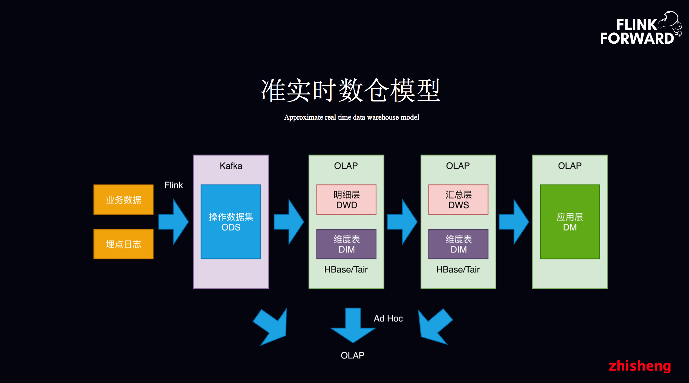 在以上两种数仓模型之外,我们发现业务方在实践过程中还有一种准实时数仓模型,其特点是不完全基于流去做,而是将明细层数据导入到 OLAP 存储中,基于 OLAP 的计算能力去做汇总并进行进一步的加工。