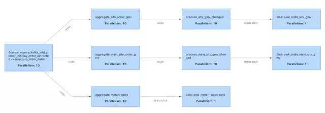 大屏的实际呈现需要保密,截图自然是没有的。以下是提交执行时Flink Web UI给出的执行计划(实际有更多的统计任务,不止3个Sink)。通过复用源数据,可以在同一个Flink job内实现更多统计需求。
