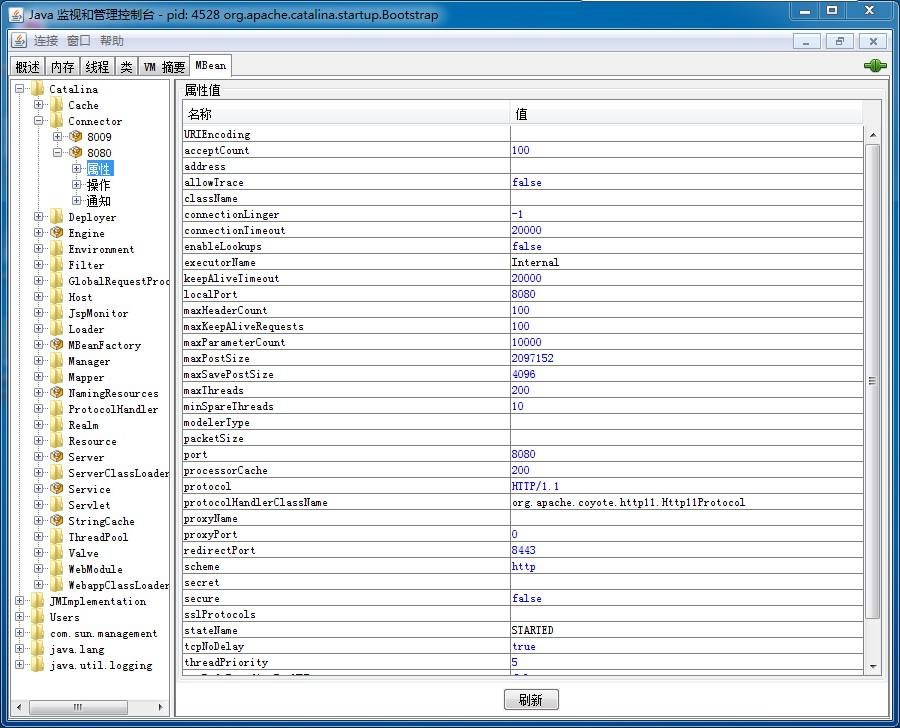 在 MBean 这一页里可以看到 Tomcat 提供的当前可以使用的 MBean 。
