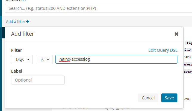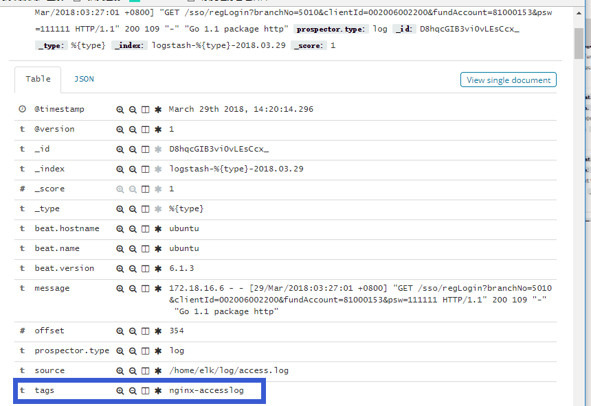 截图中的tags即表示filebeat中配置文件中的tags配置,可以将tags作为filter过滤条件进行查询。