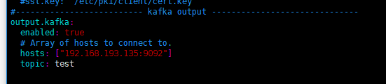 添加kafka输出的配置,将elasticsearch输出配置注释掉。hosts表示kafka的ip和端口号,topic表示filebeat将数据输出到topic为test的主题下,此处也根据自己情况修改。