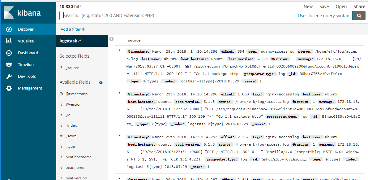 验证搭建的平台,日志数据是否能正常获取及显示。在filebeat配置文件中paths对应的目录下新增access.log文件,并且添加数据进去,然后在kibana上查看数据是否正常显示。