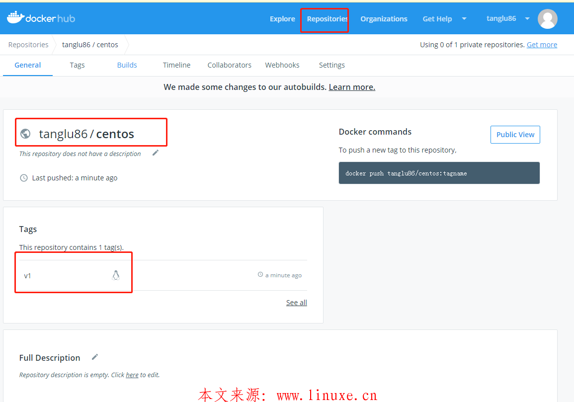 5、登录Docker Hub的Public Repository,可以看到上传的镜像。如果要删除镜像也只能在页面上操作。