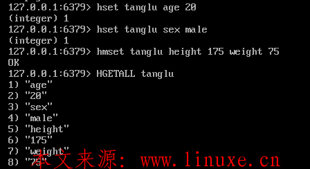 hset tanglu sex male #为tanglu新增一个sex字段,值位male