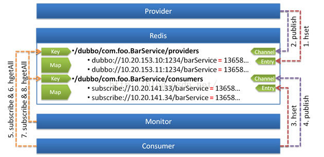 可通过<dubbo:registry group="dubbo" />设置redis中key的前缀,缺省为dubbo。