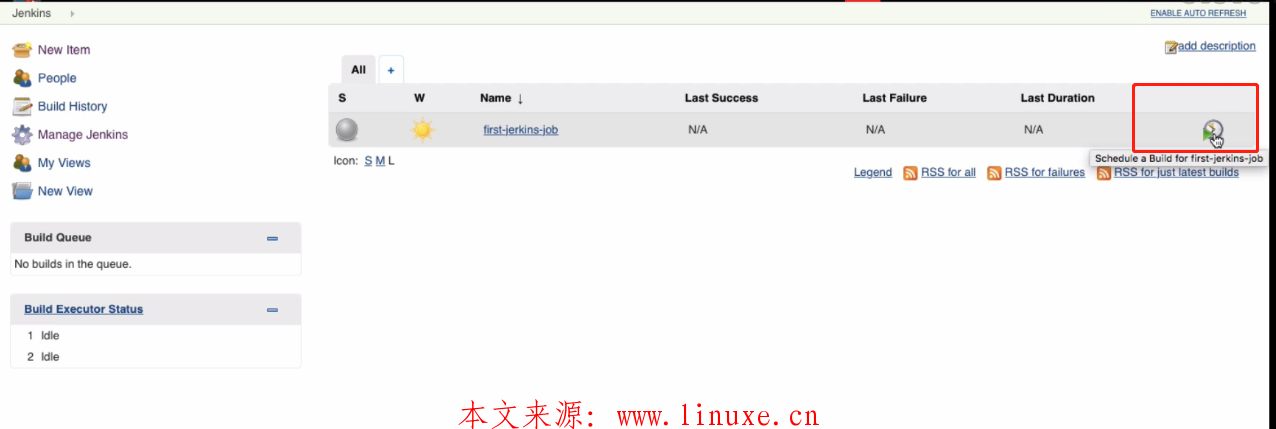 任务创建完成后返回Jenkins首页就可以看到该任务了,点击齿轮就可以运行任务了