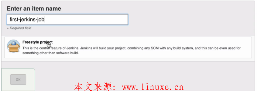 2、点击创建按钮后会要求输入一个项目的名字。这里将类型选择为Freestyle project,代表一个自由风格的项目,这种项目配置比较灵活。