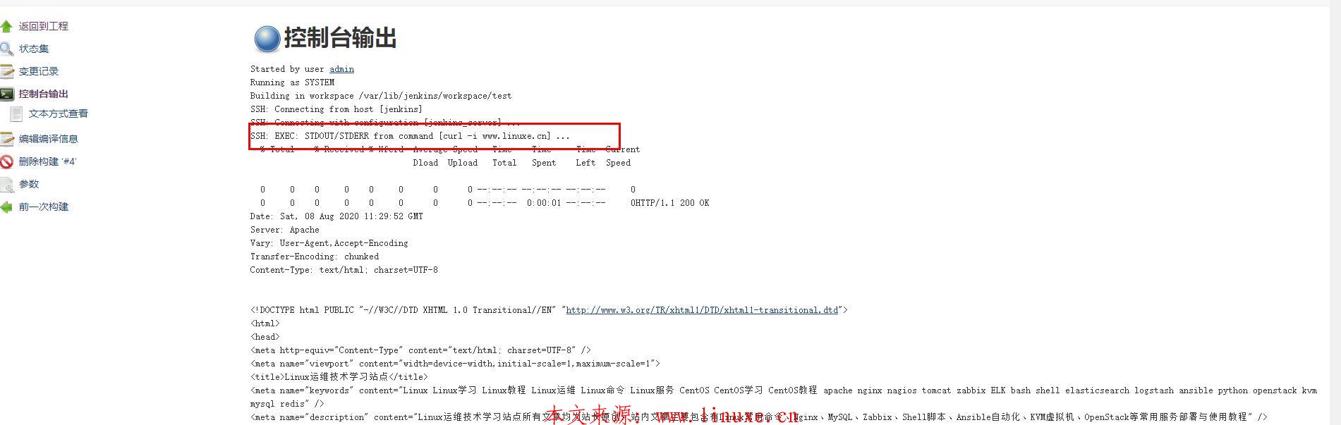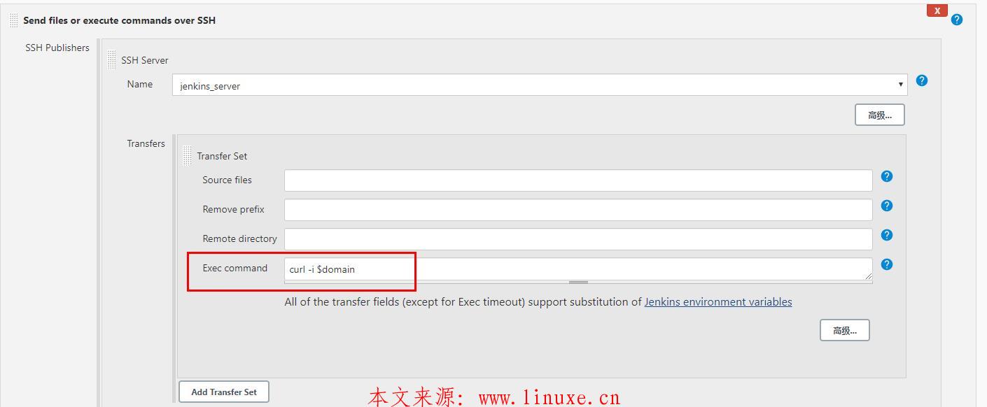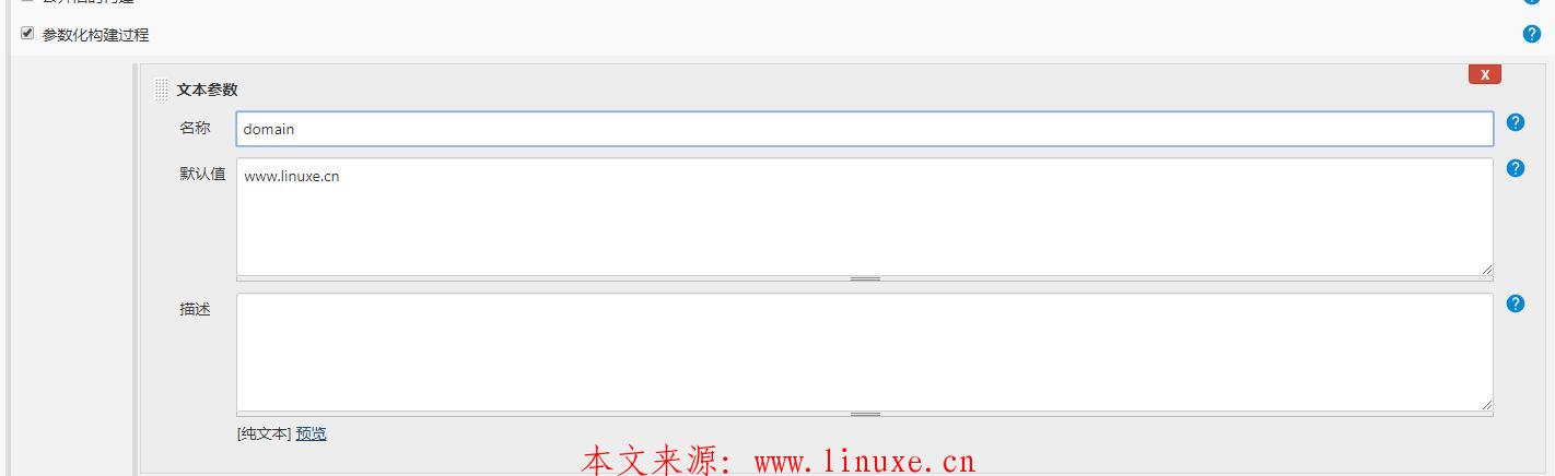 2、首先为项目开启参数化构建,这里使用了最常见的文本参数,然后定义了一个domain参数,值为www.linuxe.cn