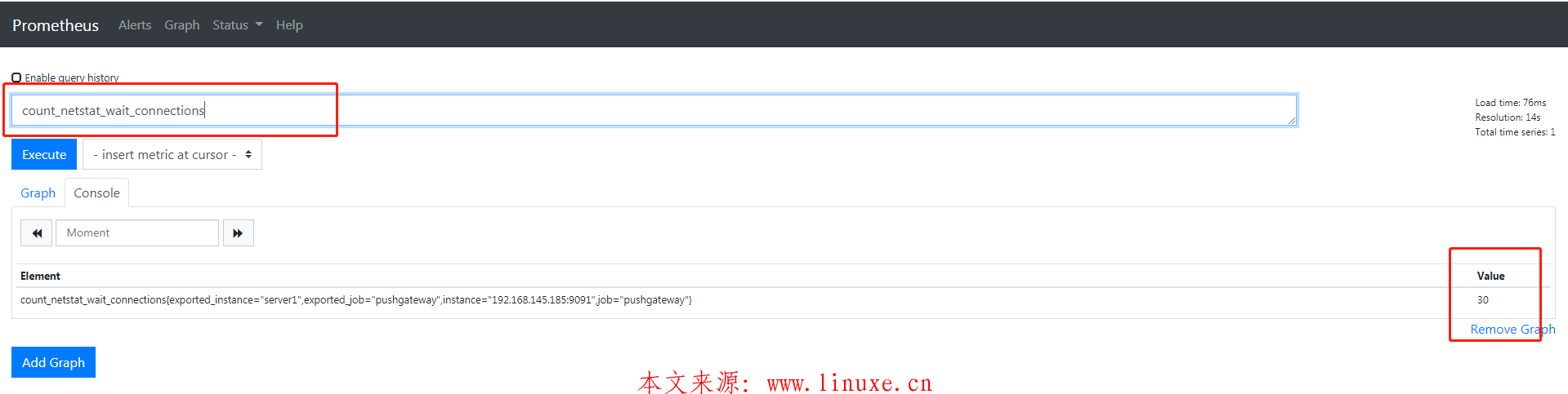echo "$label $count_netstat_wait_connections" | curl --data-binary @- http://server.com:9091/metrics/job/pushgateway_test/instance/$instance_name #这里pushgateway_test就是prometheus主配置文件里job的名字,需要保持一致,这样数据就会推送给这个job。后面的instance则是指定机器名,使用的就是脚本里获取的那个变量值