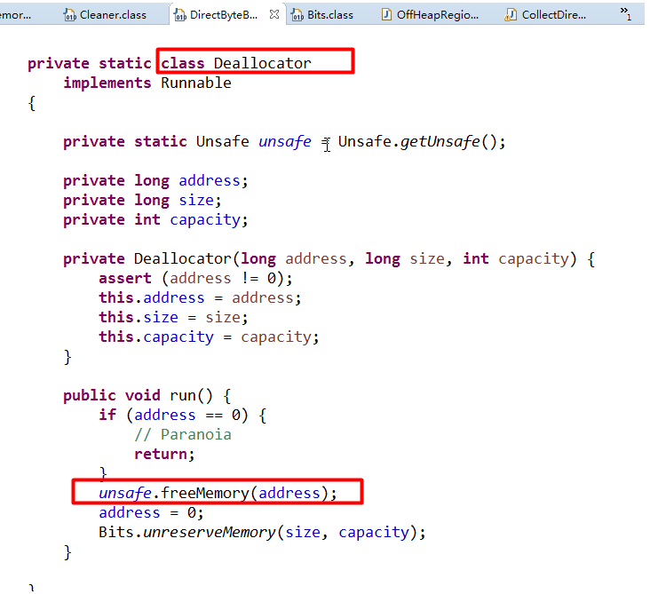 DirectByteBuffer 类有一个内部的静态类 Deallocator,这个类实现了 Runnable 接口并在 run() 方法内释放了内存,源码如下: