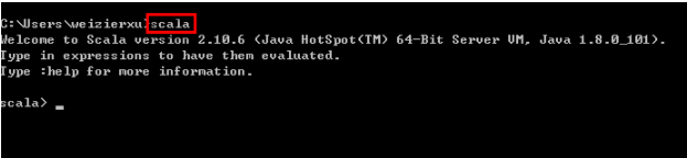 下载得到Scala的msi文件后,可以双击执行安装。安装成功后,默认会将Scala的bin目录添加到PATH系统变量中去(如果没有,和JDK安装步骤中类似,将Scala安装目录下的bin目录路径,添加到系统变量PATH中),为了验证是否安装成功,开启一个新的cmd窗口,输入scala然后回车,如果能够正常进入到Scala的交互命令环境则表明安装成功。如下图所示: