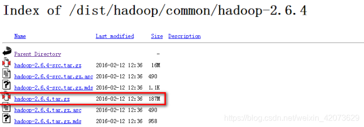 系统变量设置后,就可以在任意当前目录下的cmd中运行spark-shell,但这个时候很有可能会碰到各种错误,这里主要是因为Spark是基于Hadoop的,所以这里也有必要配置一个Hadoop的运行环境。在Hadoop Releases里可以看到Hadoop的各个历史版本,这里由于下载的Spark是基于Hadoop 2.6的(在Spark安装的第一个步骤中,我们选择的是Pre-built for Hadoop 2.6),我这里选择2.6.4版本,选择好相应版本并点击后,进入详细的下载页面,如下图所示,选择图中红色标记进行下载,这里上面的src版本就是源码,需要对Hadoop进行更改或者想自己进行编译的可以下载对应src文件,我这里下载的就是已经编译好的版本,即图中的’hadoop-2.6.4.tar.gz’文件。