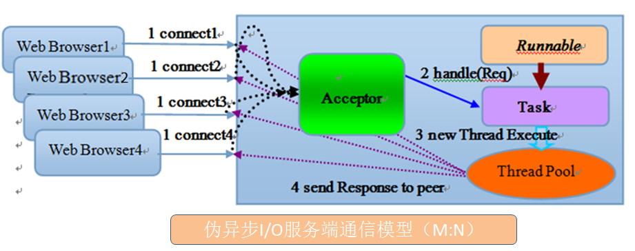 采用线程池和任务队列可以实现一种叫做伪异步的IO通信框架,它的模型图如下: