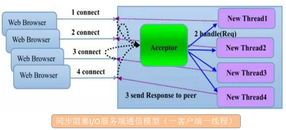 在基于传统同步阻塞模型开发中,ServerSocket负责绑定IP地址,启动监听端口,Socket负责发起连接操作,连接成功之后,双方通过输入和输出流进行同步阻塞式通信。