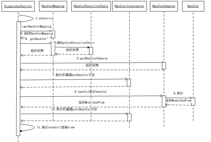 2. DispatcherServlet对请求URL进行解析,得到请求资源标识符(URI)。然后根据该URI,调用HandlerMapping获得该Handler配置的所有相关的对象(包括Handler对象以及Handler对象对应的拦截器),最后以HandlerExecutionChain对象的形式返回。 DispatcherServlet 根据获得的Handler,选择一个合适的HandlerAdapter。(附注:如果成功获得HandlerAdapter后,此时将开始执行拦截器的preHandler(...)方法)
