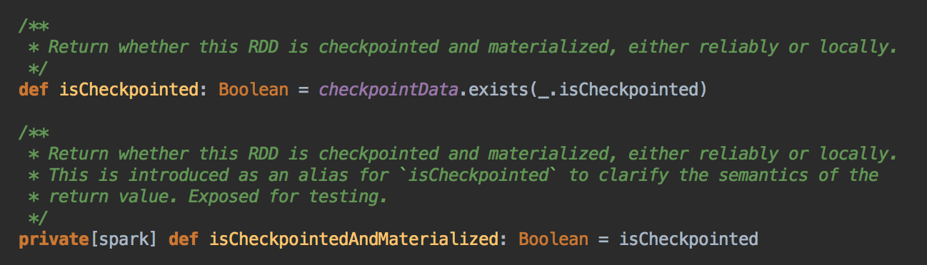 [下图是 RDD.scala 中的 isCheckpointed 变量和 isCheckpointedAndMaterialized 方法]