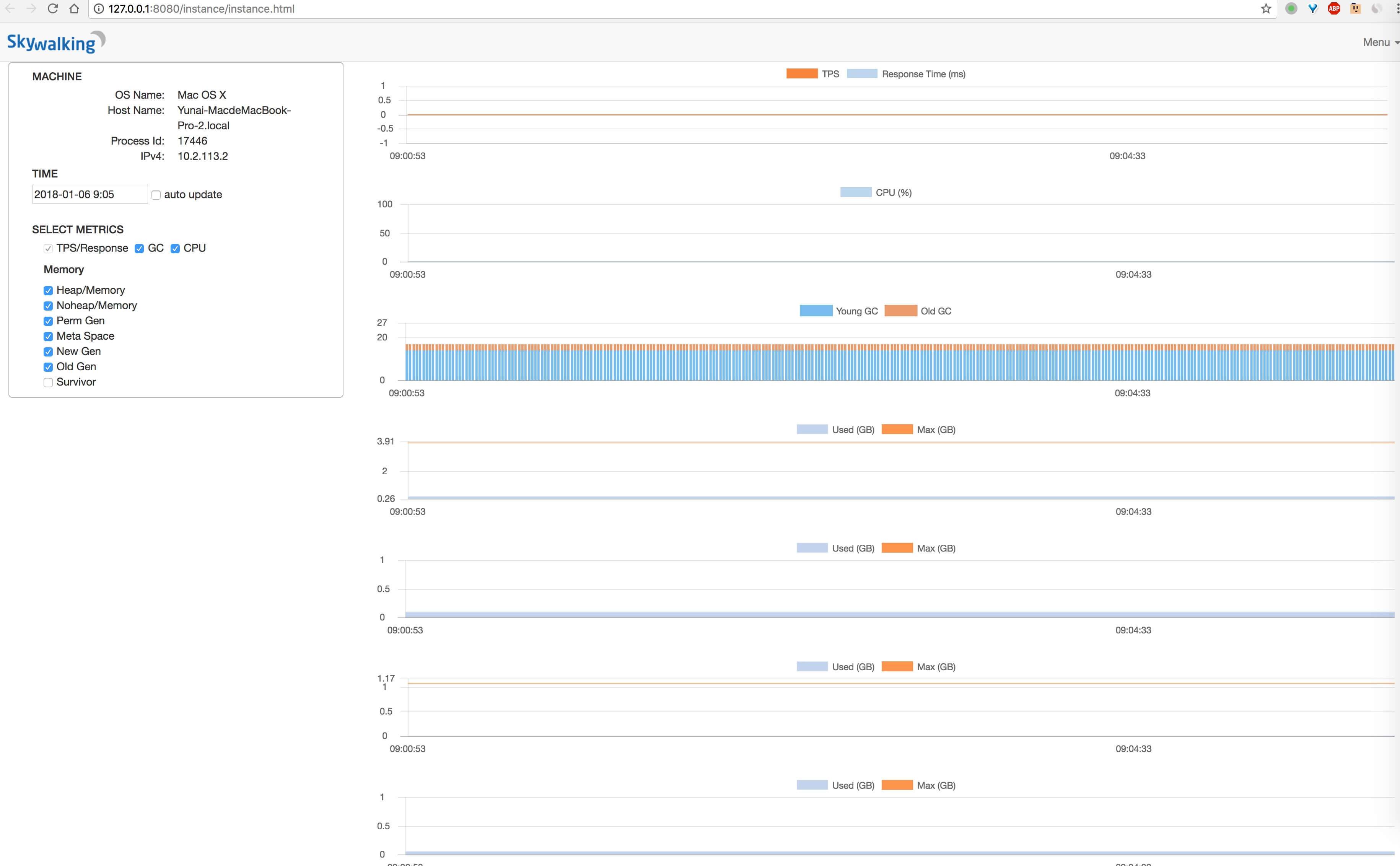 org.skywalking.apm.collector.storage.table.jvm.MemoryMetricTable, MemoryMetric 表(memory_metric)。字段如下:instance_id:应用实例编号。isHeap:是否堆内内存。init:初始化的内存数量。max:最大的内存数量。used:已使用的内存数量。committed:可以使用的内存数量。time_bucket:时间。