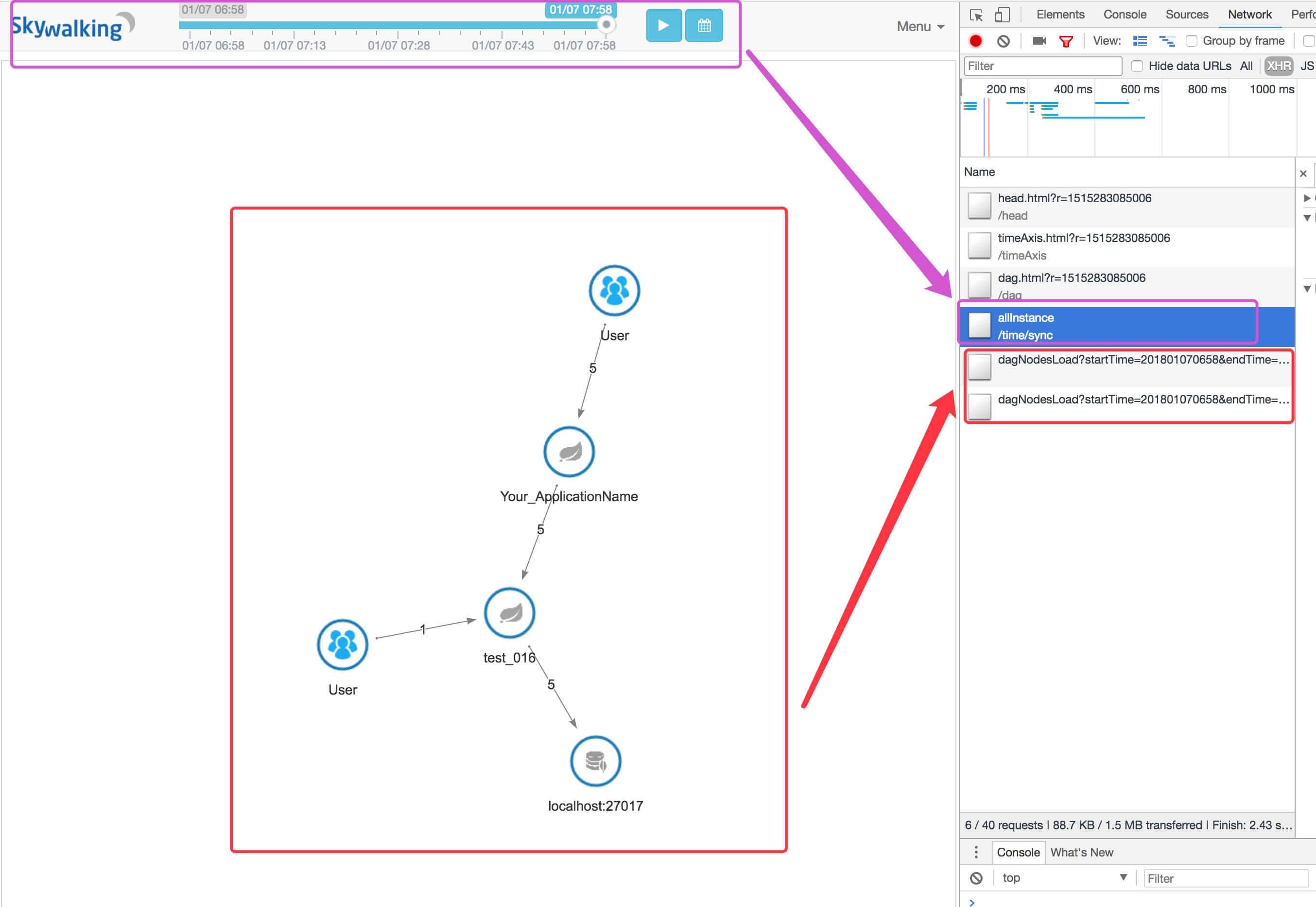 - 紫色部分,时间进度条,调用 「2. AllInstanceLastTimeGetHandler」 接口,获得应用实例最后心跳时间。大多情况下,我们进入该界面,看的是从最后心跳时间开始的应用调用情况。