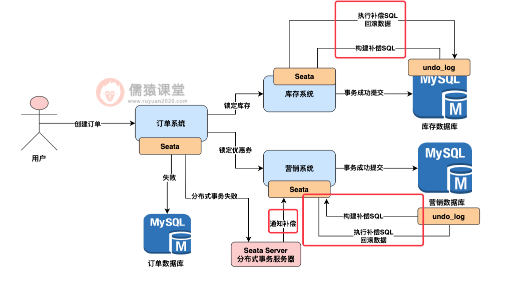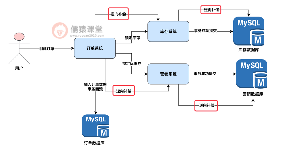 我们其实希望的效果是,如果订单要是插入数据库失败了,订单数据库本地事务回滚了,我们应该想办法去通知一下库存系统和营销系统,把之前在库存数据库和营销数据库里已经提交的数据修改做一个逆向补偿,进行恢复。