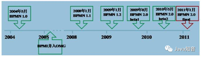 2004年5月发布了BPMN1.0规范.BPMI于2005年9月并入OMG(The Object Management Group对象管理组织)组织。OMG于2011年1月发布BPMN2.0的最终版本。