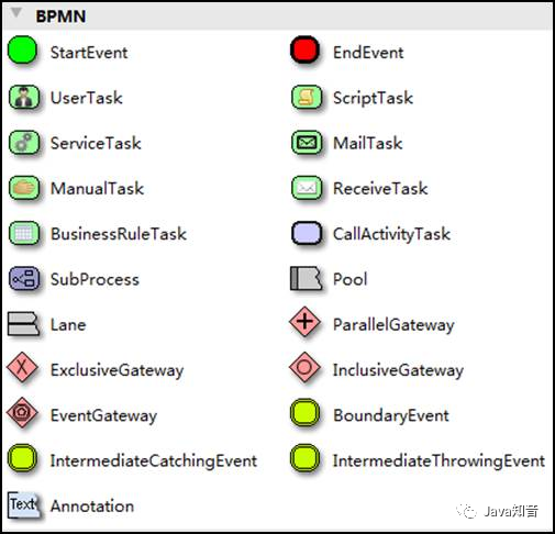 BPMN 是目前被各 BPM 厂商广泛接受的 BPM 标准。Activiti 就是使用 BPMN 2.0 进行流程建模、流程执行管理,它包括很多的建模符号,比如:Event