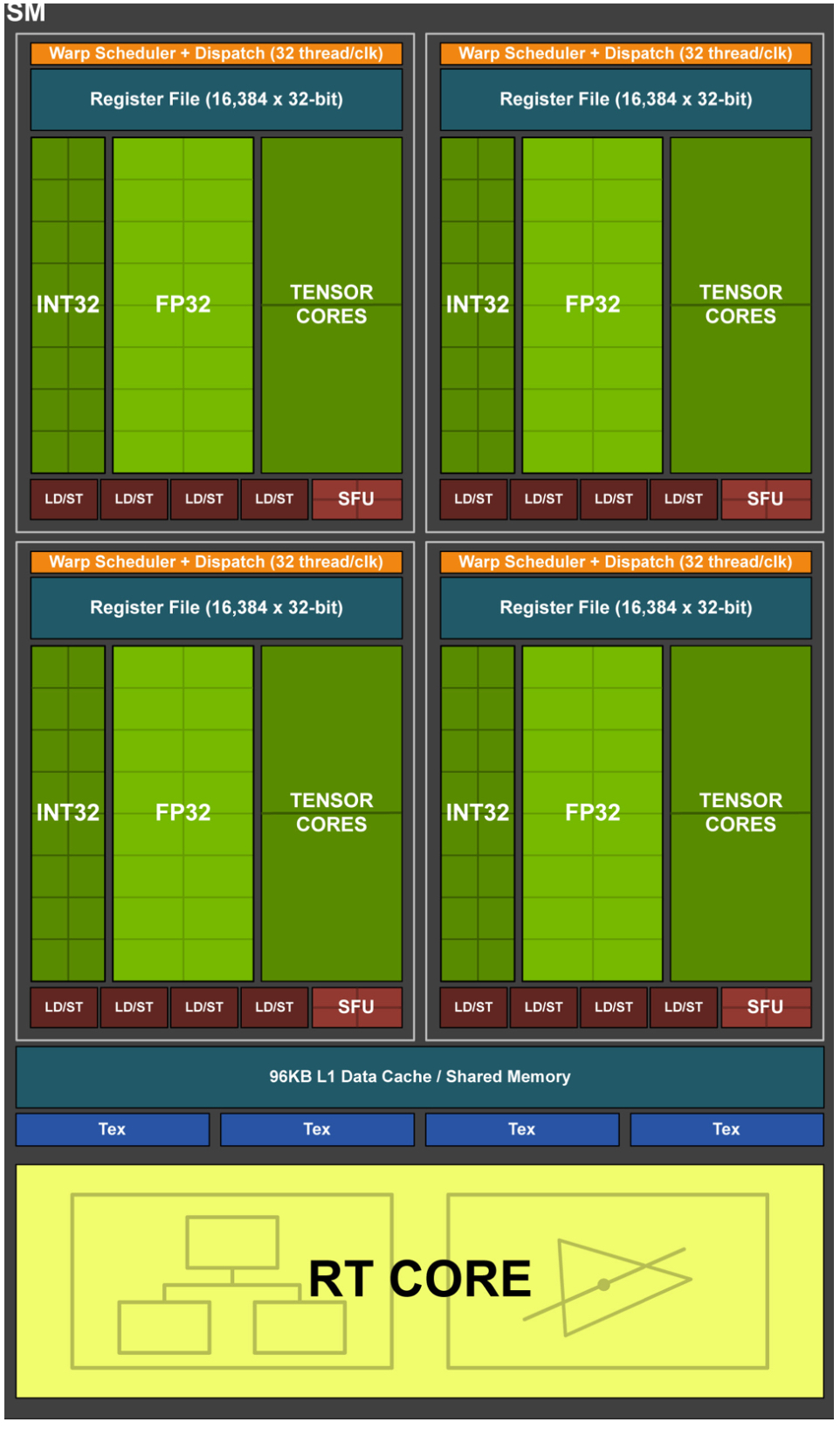 同CUDA Core一样,Tensor Core也是一种运算单元,专门处理矩阵乘运算。如下图为Turing TU102/TU104/TU106的SM内部结构图,分为4个processing blocks,每个processing block包含16个FP32 Cores、16个INT32 Cores、2个Tensor Cores、1个Warp Scheduler和1个Dispatch Unit。