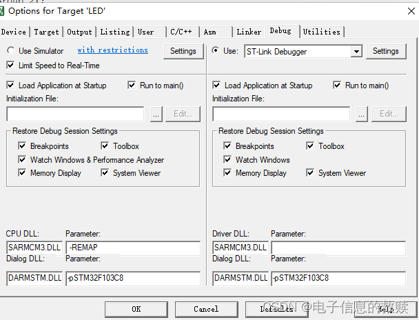 keil报错:unknown signal的解决方法 首先如下图,需要设置勾选为软件仿真(这里设置为硬件仿真不行),其次后面的参数也需要改。第二个红圈里勾选的-pSTM32F103从这里是根据自己的芯片进行。