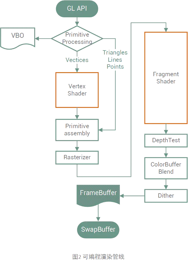 固定渲染管线的OpenGLES不需要也不允许你自己去定义顶点渲染和像素渲染的具体逻辑,它内部已经固化了一套完整的渲染流程,只需要开发者在CPU代码端输入渲染所需要的参数并指定特定的开关,就能完成不同的渲染。