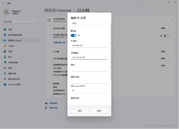 - 如果遇到访问不到的情况,则电脑需要配置同网段的IP地址,打开网络和Internet设置,如下图所示,所配置的IP地址和搜索到的摄像机IP地址前三项一致即可,如下图所示: