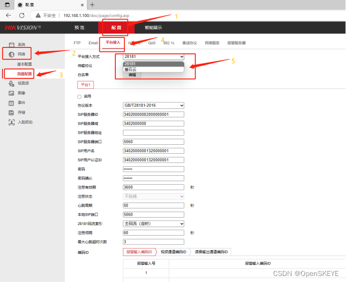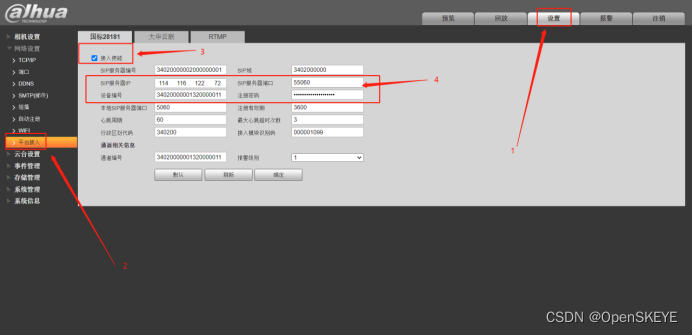 (3) 通过 设置->网络设置->平台接入->国标28181配置国标接入,如下图所示: