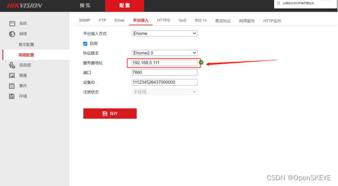 - 登录后台后,打开“配置”->”网络”->高级配置->选择 平台接入方式,如果有EHome则选择Ehome协议(2.0或者5.0), 如果没有则选择28181协议接入,如下图所示:
