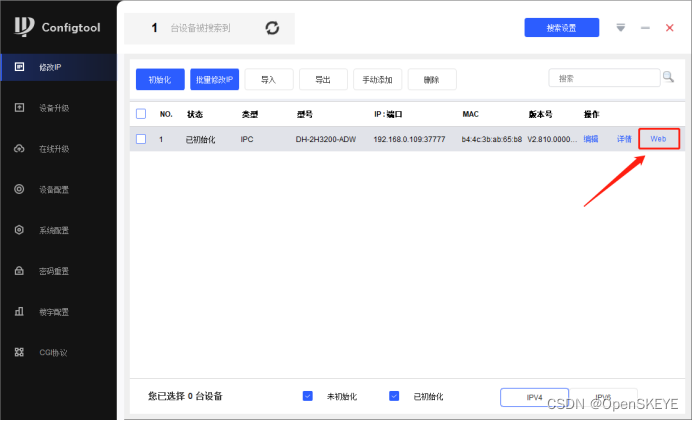 (2)点击“WEB”进入摄像机后台,或者IP地址(192.168.1.100)的方式通过http://192.168.1.100访问web后台,如下图所示: