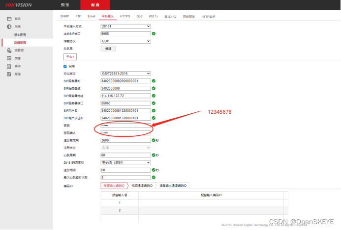 首先,勾选 启动,然后选择协议,然后依次配置服务器SIP IP和端口,密码: 12345678,SIP用户名和SIP用户认证ID配置成一样的即可,具体可以根据点位文档的国标编码ID来设置,如下图所示: