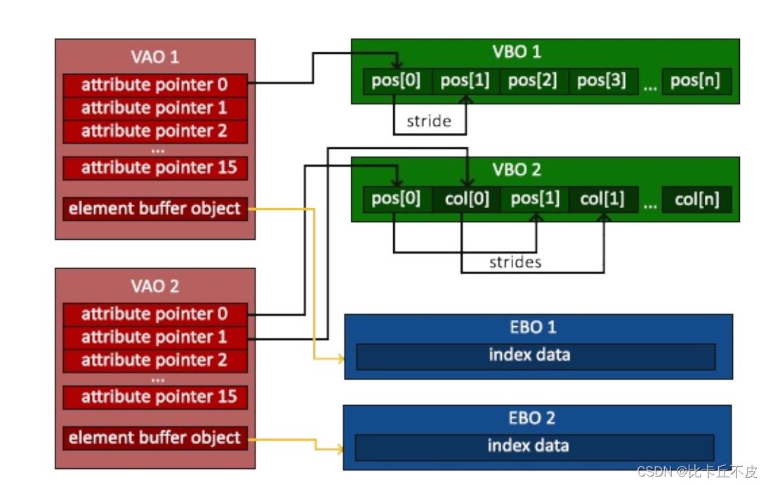 通俗的讲: 还记得我说过,VAO就是个工头,VBO是工人,我们让VBO休息后,我们可以用 VAO来找到VBO的人,然后EBO不一样,他只是个临时工,你让临时工走了,EBO就没有办法找到他了,所以,在代码中我们不能 glBindBuffer(GL_ELEMENT_ARRAY_BUFFER, 0); 所以我们想要使用EBO必须一直绑定着。