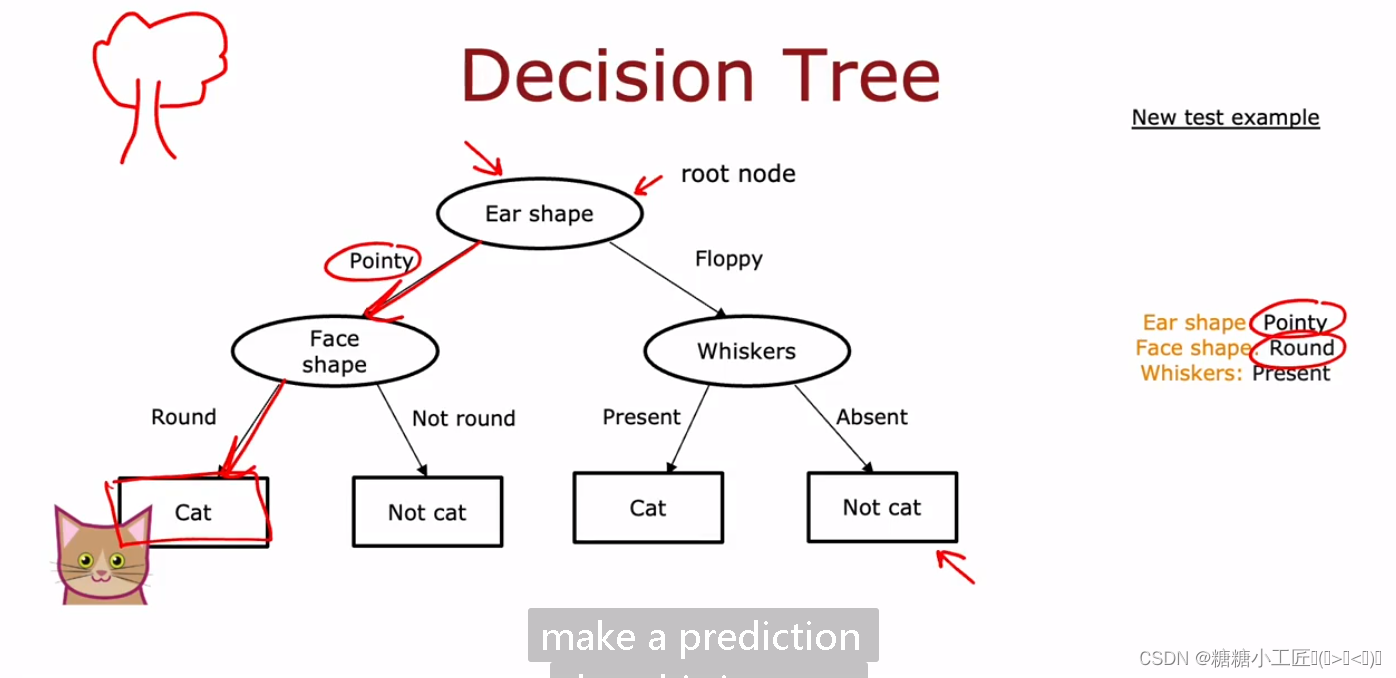 【机器学习简单笔记】【P5】 决策树(Decision Tree) 决策树就是基于树的结构进行决策,可以看做是对"这个样本是正类吗"这个问题的的"决策"过程,通过一系列判断,作出回答.如上图所示,我们判断一个小动物是否是猫,第一个问题是"它的耳朵形状是尖的还是软塌的?",如果是"尖的",则提问"它的脸型是圆的还是非圆的?",若是"圆脸",就决策出了它是"猫",否则就不是.于是我们得到"尖耳,圆脸"的是猫,"软塌耳,有胡须"的也是猫,"尖耳,脸不圆"和"软塌耳,无胡须"的则不是猫.这就是一棵简单的决策树,判断小动物是否是猫的过程正是决策的过程.
