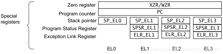 ARMv8有31个通用寄存器X0-X30, 还有SP、PC、XZR等寄存器