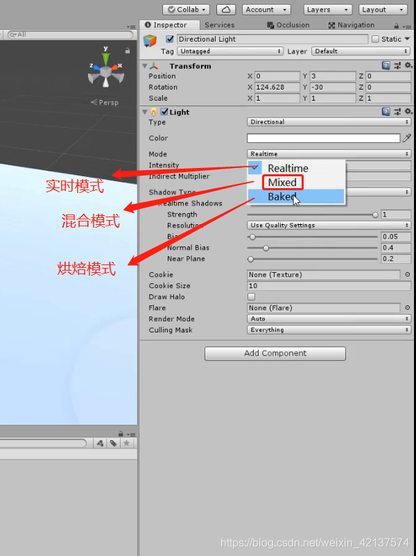 混合模式:实时和烘焙的混合(建议烘焙调试时使用,修改参数实时预览效果,改好参数后再改为烘焙模式即可)