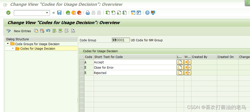本文讲述了在SAP系统中,尝试通过QS41事务代码维护Catalog 3(Usage Decisions)的CodeGroup时遇到的错误,并指导读者如何在后台配置中正确维护决策相关的代码组,如维护NM0001代码组及其代码含义。