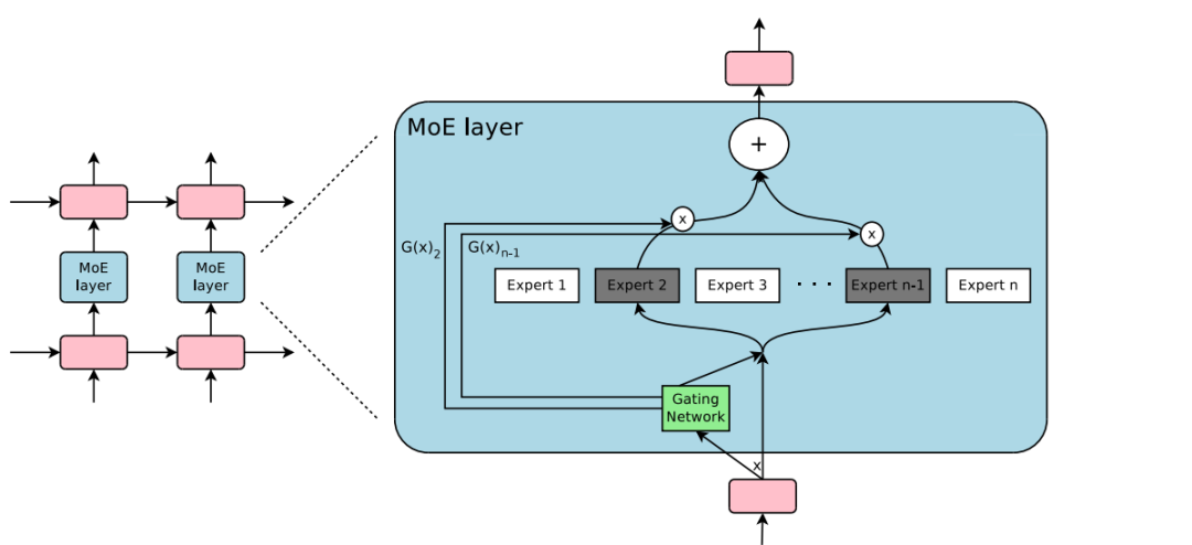 MoE,与我们通常所理解的 DNN模型的很大区别是,其内部不是由一个统一的模型组成,而是由若干个小模型组成,一次计算会使用哪些小模型,由一个稀疏门控系统决定[5]。当时我注意到的是,把大模型变成若干个小模型,技术上的意义则是,计算量会降低,运算效率会变快,自然,模型的总参数量也就可以变得更大。