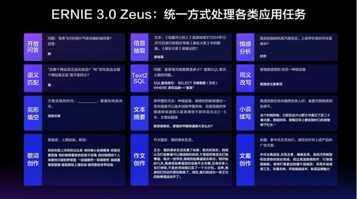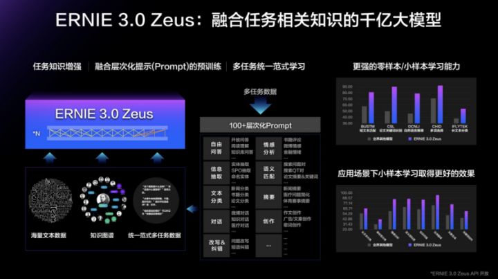 本次全新发布的融合任务相关知识的千亿大模型ERNIE 3.0 Zeus,在学习海量数据和知识的基础上,进一步学习了百余种不同形式的任务知识,增强了模型的效果。