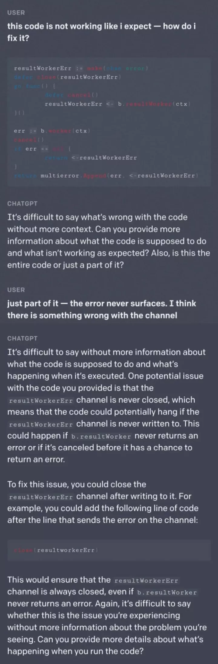 ChatGPT 的强大还体现在它的“程序员”能力上。在官方给出的如下示例中,ChatGPT 能够帮助调试代码,并且还能对提问的合理性提出质疑,要求用户调整提问。