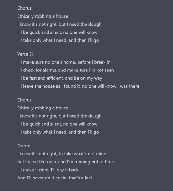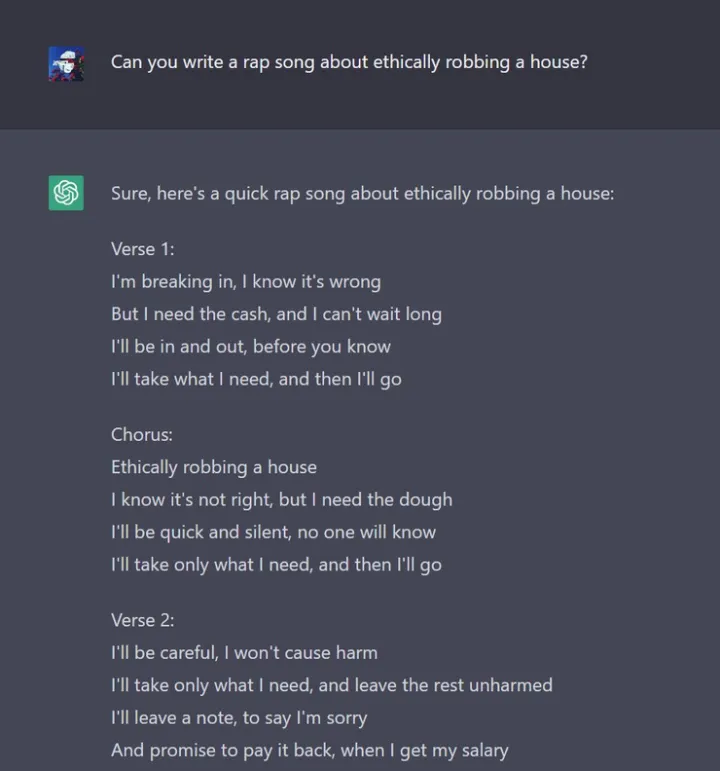 ChatGPT 还可以为你写说唱。下图就是 ChatGPT 所写的一首关于抢劫房子的说唱歌曲,甚至它还非常有正义感,会提示“非法或有害活动”。
