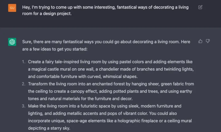 比如有网友向 ChatGPT 询问客厅装修的设计建议,并根据它给出的描述在 Midjourney 上获得了精致的图像: